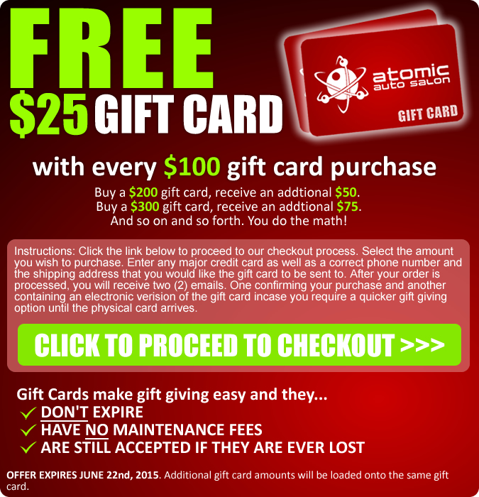 Instructions: Click the checkout button below to proceed to our gift card store. Use any major credit card or debit card to purchase one or more of the gift certificates below (sold in $25 increments). When done, click the "View Cart" button and go to "Secure Checkout". After your order is processed, you will receive an email confirmation of your purchase and will also receive another email with an electronic version of you gift card incase you need a quicker gift giving option until the physical card arrives.